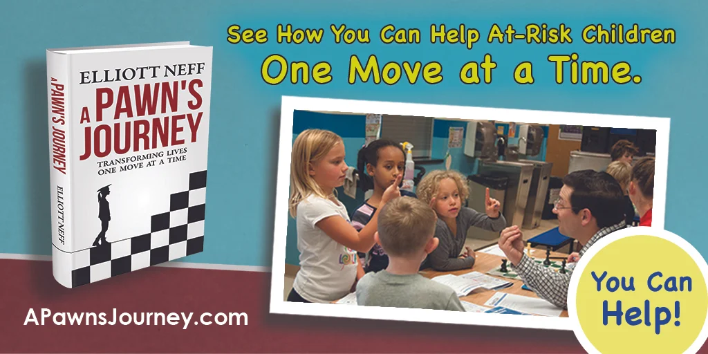 My friend and National Master Elliott Neff has worked full-time to help thousands of children develop life skills through the fun game of chess. Elliott has just released his first book, A Pawn’s Journey: Transforming Lives One Move at a Time inspired by true-life stories of students’ lives being transformed by learning the game. I highly recommend the book. Go buy your copy now. Elliott is offering 3 months online chess lessons free when you buy the book during the launch.